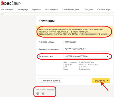 Далее, выбираем данные СТ Нахимовец и после нажатия на кнопку - Продолжить - открывается окно квитанции. Подтверждаем данные СТ "Нахимовец" и снова нажимаем кнопку продолжить. Смотрим иллюстрацию.