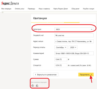 После нажатия кнопки - Продолжить - попадаем в пункт - окно ввода номера участка - как лицевого счёта - и ввода в комментариях к квитанции - показаний счётчиков за расход электроэнергии и воды - и оплачиваемый период. Выбираем категорию ЖКУ и вводим свои данные. Смотрим иллюстрацию.