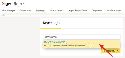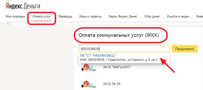 В появившемся верхнем меню - выбираете - Оплата услуг - Оплата коммунальных услуг (ЖКХ). Вводите в появившемся окошке ИНН СТ Нахимовец - 9203536636 - в нижнем окошке появится информация по СТ "Нахимовец" с адресом, по которому зарегистрировано СТ. Смотрим иллюстрацию.