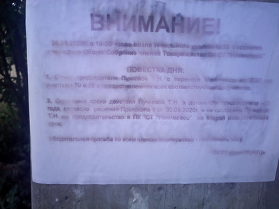 Текст объявления. (Текст восстановлен с фотокопии объявления о собрании, размещённого у участка 88. Фотокопия прилагается. Текст размыт после ливней 29, 30 сентября 2020.)