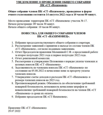 Общее собрание членов ПК СТ "Нахимовец", проводимое в форме очного голосования, состоится 14 августа 2022 года в 10:00.