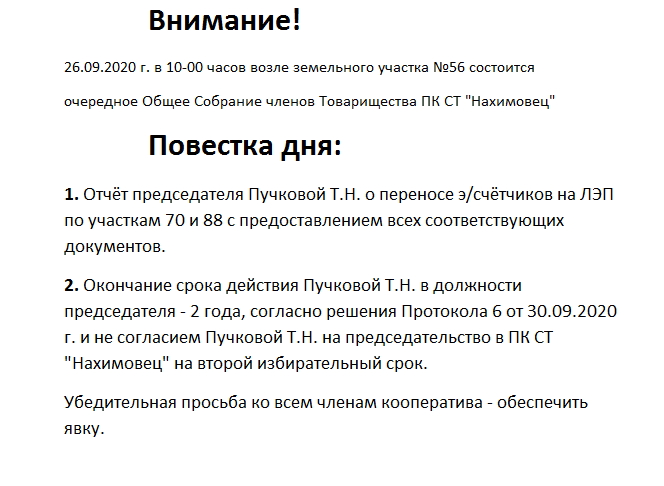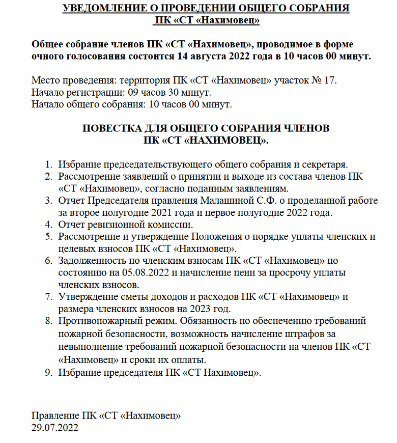 Общее собрание членов ПК СТ "Нахимовец", проводимое в форме очного голосования, состоится 14 августа 2022 года в 10:00.