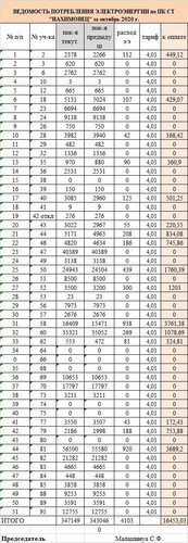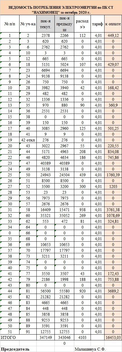 Ведомость потребления электроэнергии в ПК СТ "Нахимовец" за октябрь 2020. Размер изображения увеличивается при нажатии на изображение.