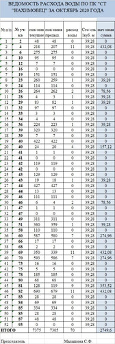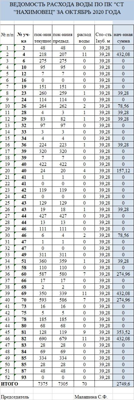 Ведомость расхода воды по ПК СТ "Нахимовец" за октябрь 2020. Размер изображения увеличивается при нажатии на изображение.