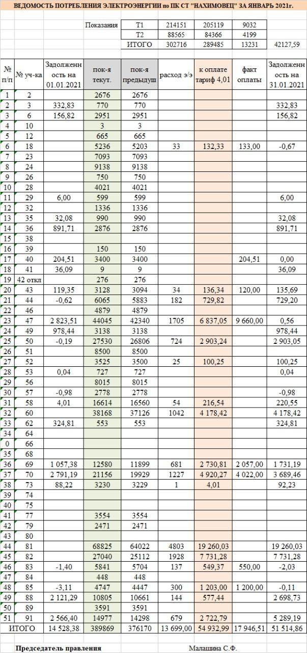 Ведомость потребления электроэнергии в ПК СТ "Нахимовец" за январь 2021. Размер изображения увеличивается при нажатии на изображение.