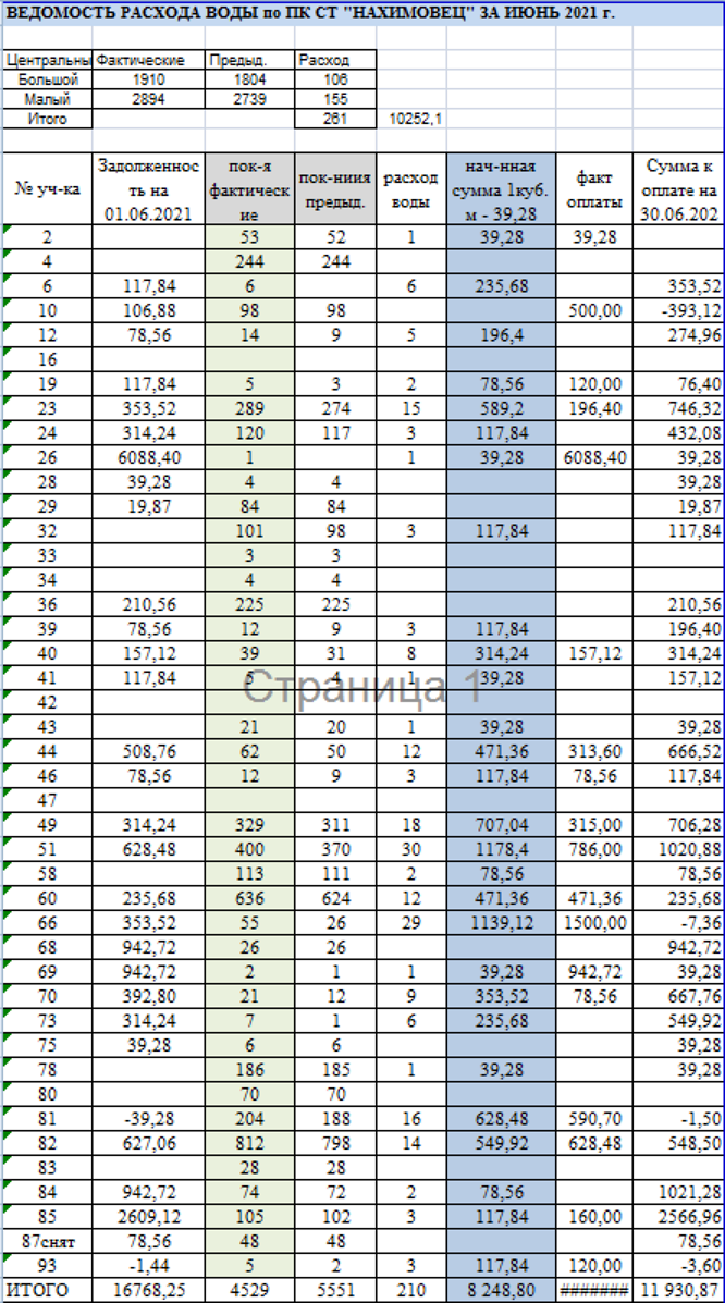 Ведомость расхода воды по ПК СТ "Нахимовец" за июнь 2021. Размер изображения увеличивается при нажатии на изображение.