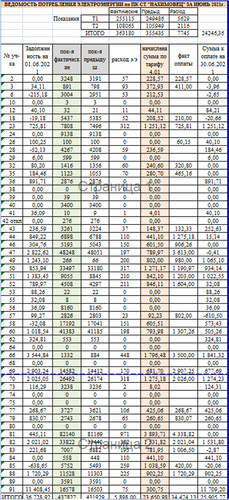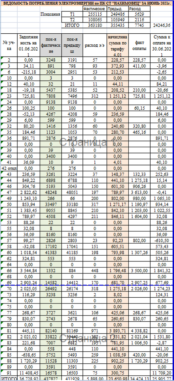 Ведомость потребления электроэнергии в ПК СТ "Нахимовец" за июнь 2021. Размер изображения увеличивается при нажатии на изображение.