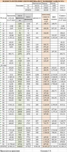 Ведомость потребления электроэнергии в ПК СТ "Нахимовец" за июль 2021. Размер изображения увеличивается при нажатии на изображение.