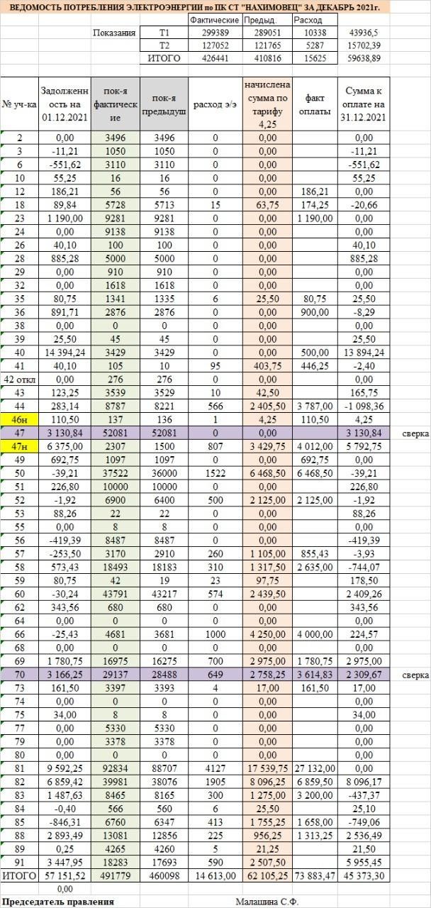 Ведомость потребления электроэнергии в ПК СТ "Нахимовец" за декабрь 2021. Размер изображения увеличивается при нажатии на изображение.
