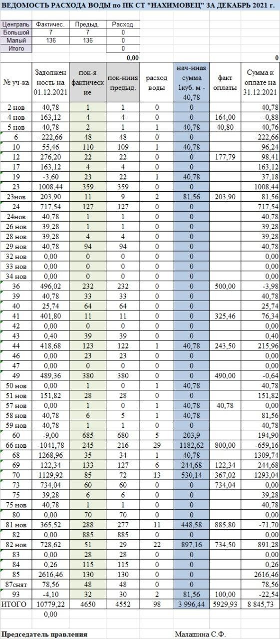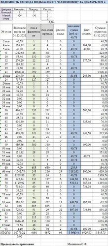 Ведомость расхода воды по ПК СТ "Нахимовец" за декабрь 2021. Размер изображения увеличивается при нажатии на изображение.