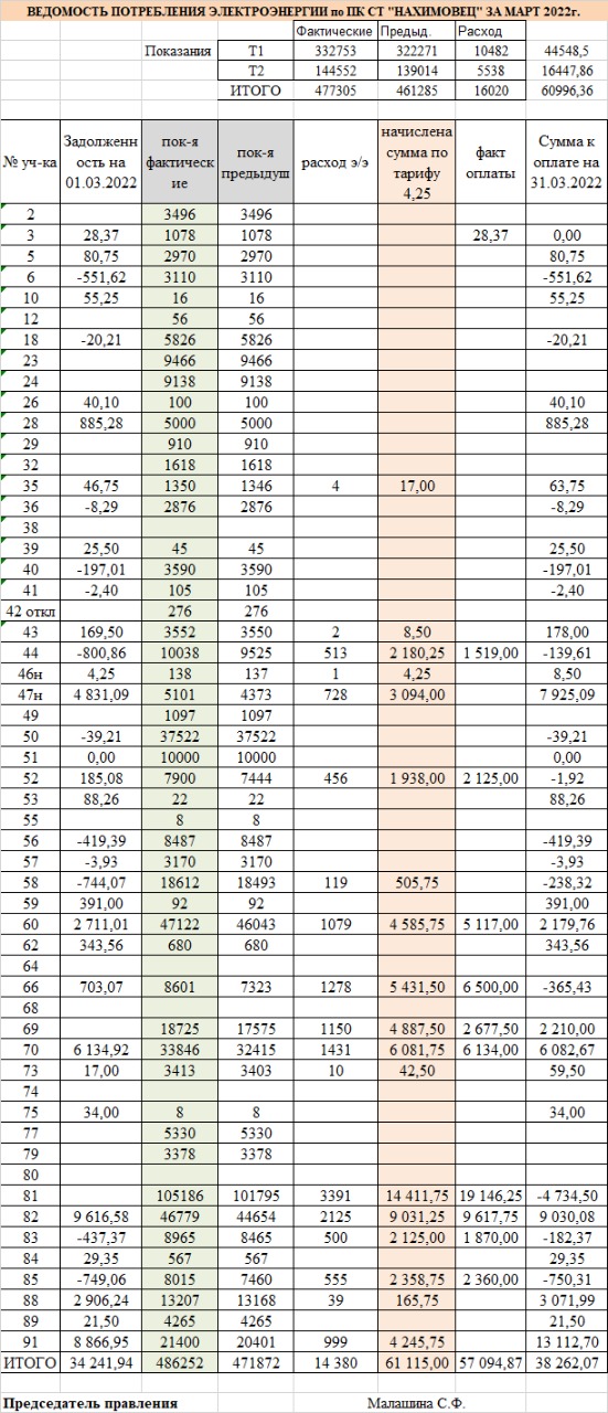 Ведомость потребления электроэнергии в ПК СТ "Нахимовец" за март 2022. Размер изображения увеличивается при нажатии на изображение.