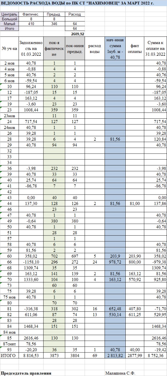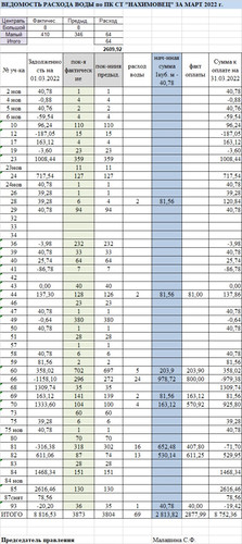 Ведомость расхода воды по ПК СТ "Нахимовец" за март 2022. Размер изображения увеличивается при нажатии на изображение.