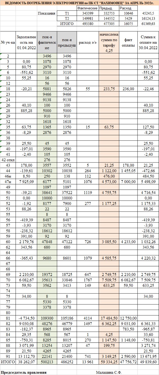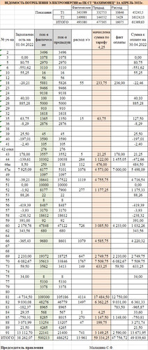 Ведомость потребления электроэнергии в ПК СТ "Нахимовец" за апрель 2022. Размер изображения увеличивается при нажатии на изображение.