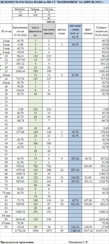 Ведомость расхода воды по ПК СТ "Нахимовец" за апрель 2022. Размер изображения увеличивается при нажатии на изображение.