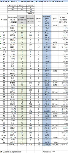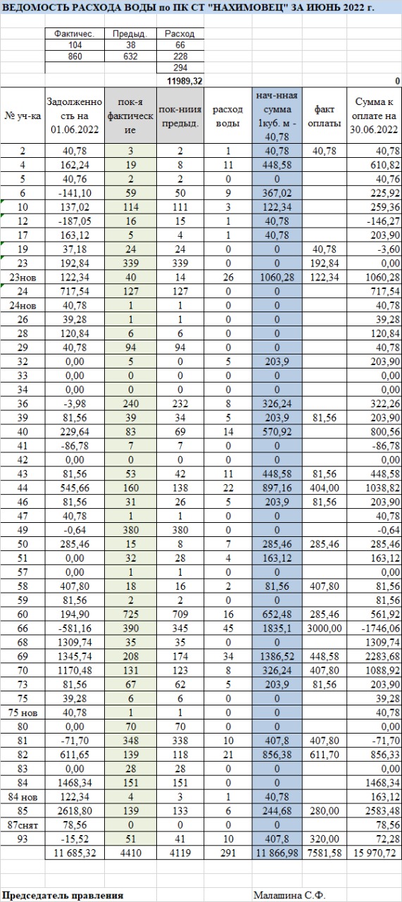 Ведомость расхода воды по ПК СТ "Нахимовец" за июнь 2022. Размер изображения увеличивается при нажатии на изображение.