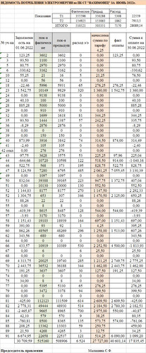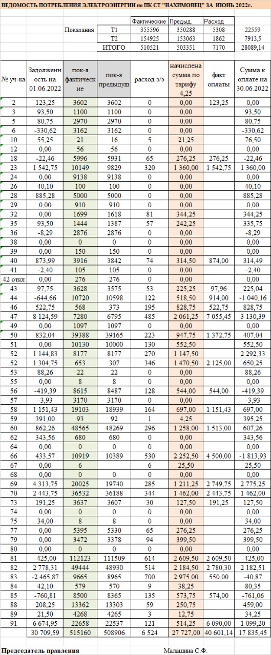 Ведомость потребления электроэнергии в ПК СТ "Нахимовец" за июнь 2022. Размер изображения увеличивается при нажатии на изображение.