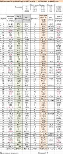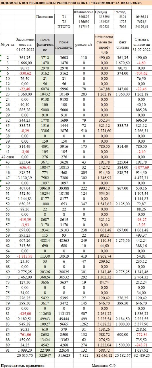 Ведомость потребления электроэнергии в ПК СТ "Нахимовец" за июль 2022. Размер изображения увеличивается при нажатии на изображение.