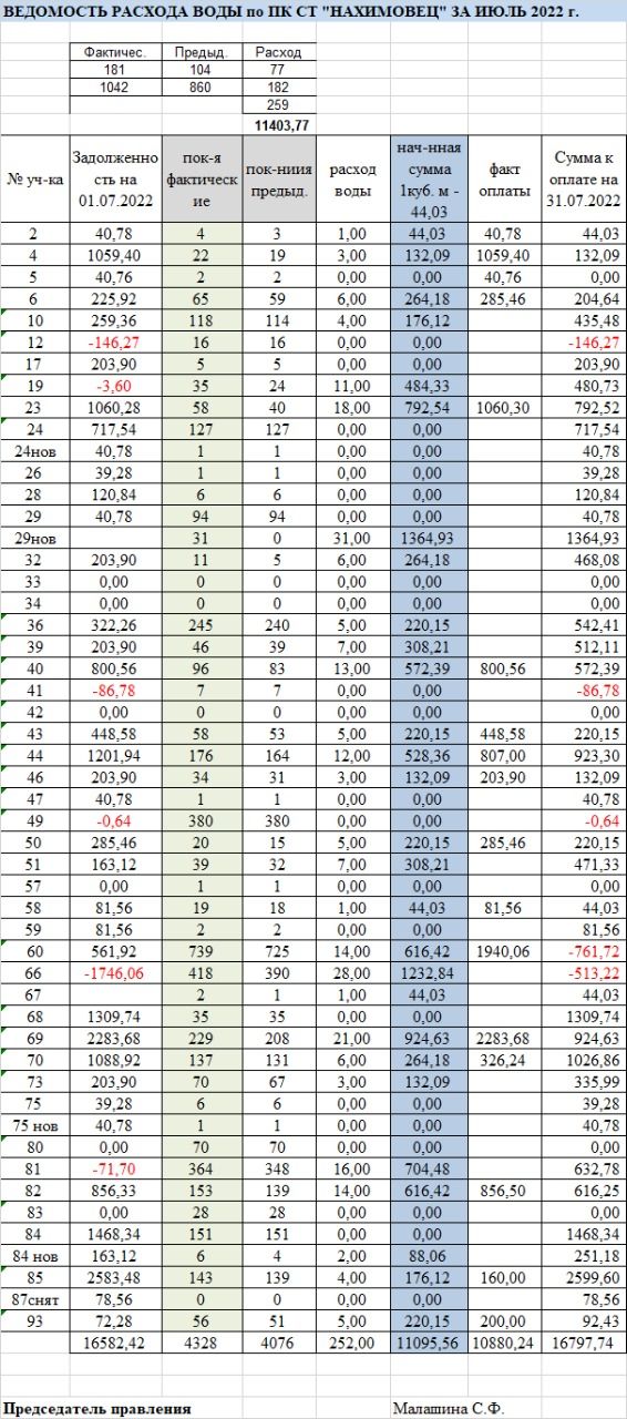 Ведомость расхода воды в ПК СТ "Нахимовец" за июль 2022. Размер изображения увеличивается при нажатии на изображение.