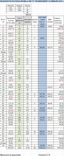 Ведомость расхода воды в ПК СТ "Нахимовец" за январь 2023. Размер изображения увеличивается при нажатии на изображение.