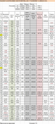 Ведомость потребления электроэнергии в ПК СТ "Нахимовец" за январь 2023. Размер изображения увеличивается при нажатии на изображение.