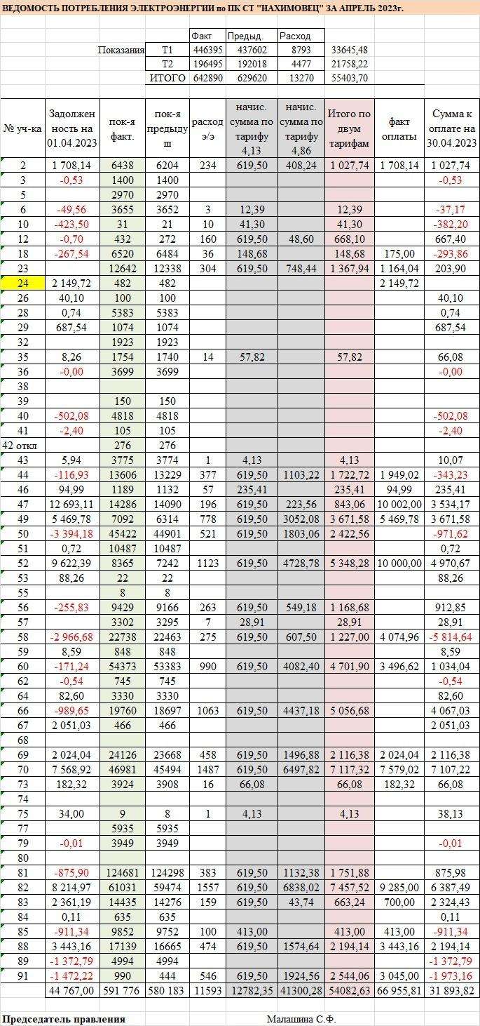 Ведомость потребления электроэнергии в ПК СТ "Нахимовец" за апрель 2023. Размер изображения увеличивается при нажатии на изображение.