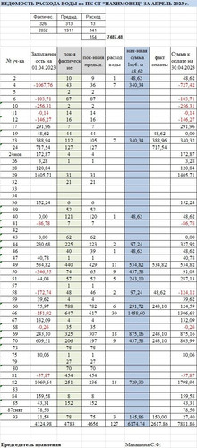 Ведомость расхода воды в ПК СТ "Нахимовец" за апрель 2023. Размер изображения увеличивается при нажатии на изображение.