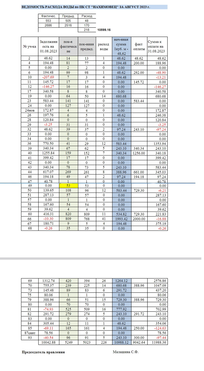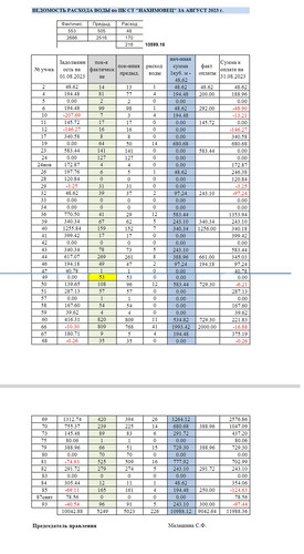 Ведомость расхода воды в ПК СТ "Нахимовец" за август 2023. Размер изображения увеличивается при нажатии на изображение.