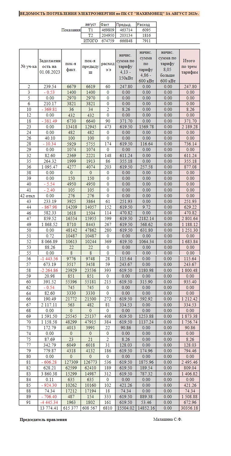 Ведомость потребления электроэнергии в ПК СТ "Нахимовец" за август 2023. Размер изображения увеличивается при нажатии на изображение.