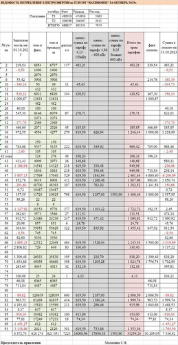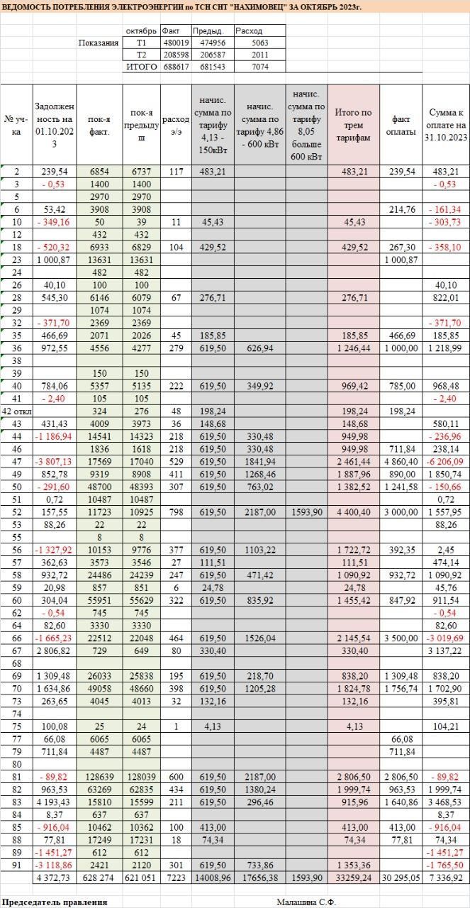 Ведомость потребления электроэнергии в ПК СТ "Нахимовец" за октябрь 2023. Размер изображения увеличивается при нажатии на изображение.