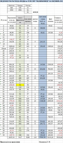 Ведомость расхода воды в ПК СТ "Нахимовец" за октябрь 2023. Размер изображения увеличивается при нажатии на изображение.