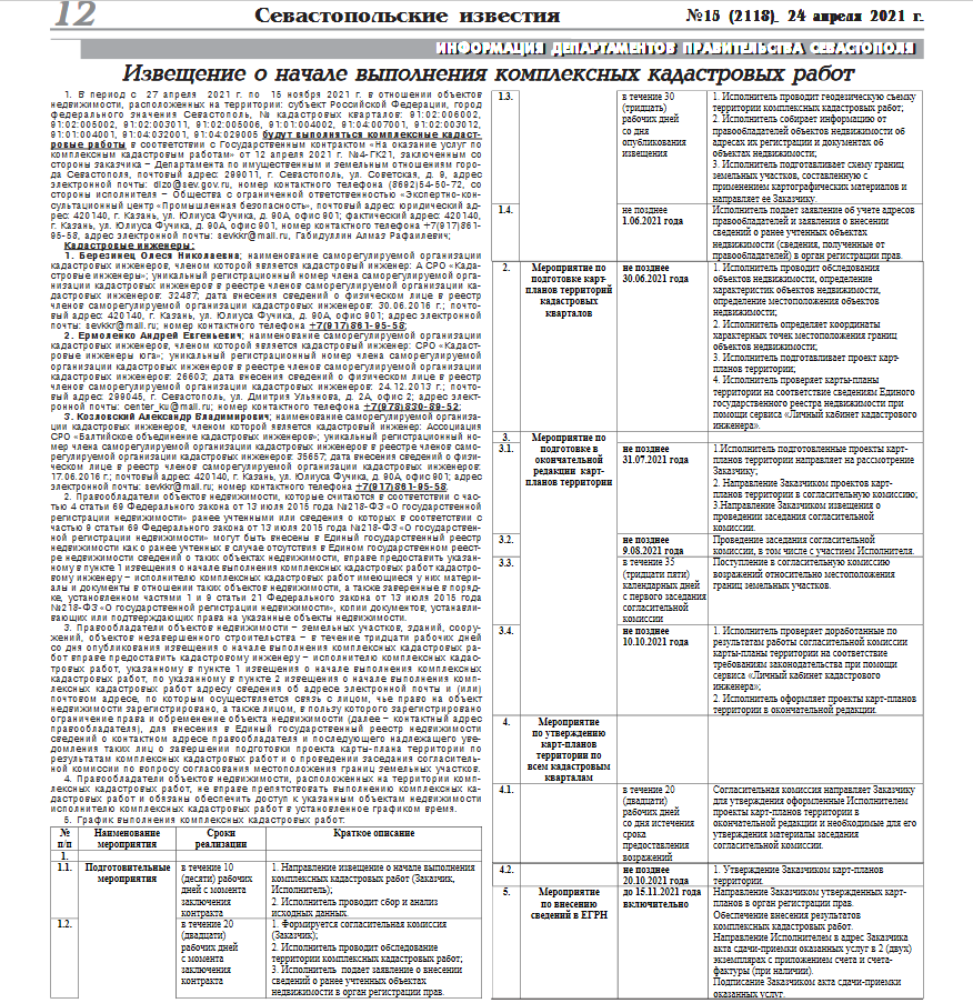 Скрин Извещения о начале выполнения комплексных кадастровых работ с сайта газеты "Севастопольские известия" №15 от 24 апреля 2021.