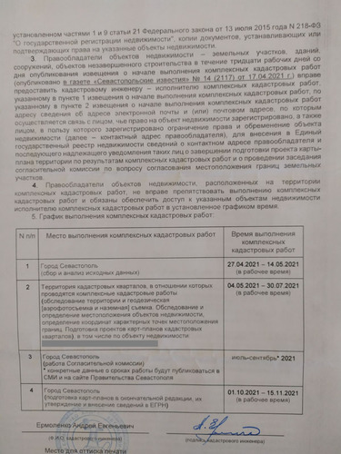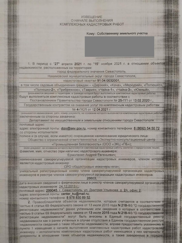 1. В период с 27 апреля 2021 г. по 15 ноября 2021 г. в отношении объектов недвижимости, расположенных на территории: субъект Российской Федерации, город федерального значения Севастополь, № кадастровых кварталов: 91:02:006002, 91:02:005002, 91:02:003011, 91:02:005006, 91:01:004002, 91:04:007001, 91:02:003012, 91:01:004001, 91:04:032001, 91:04:029005 будут выполняться комплексные кадастровые работы в соответствии с Государственным контрактом «На оказание услуг по комплексным кадастровым работам» от «12» апреля 2021 г. № 4-ГК21 , заключенным со стороны заказчика: Департамент по имущественным и земельным отношениям города Севастополя, почтовый адрес: 299011, г. Севастополь, ул. Советская, д. 9