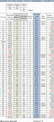 Ведомость расхода воды в ТСН СНТ "Нахимовец" за декабрь 2023. Размер изображения увеличивается при нажатии на изображение.