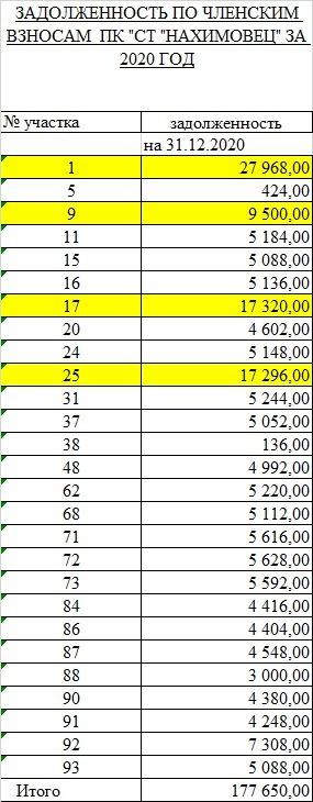 Статистические данные задолженности по членским взносам в СТ "Нахимовец" на 31 декабря 2020.
