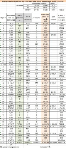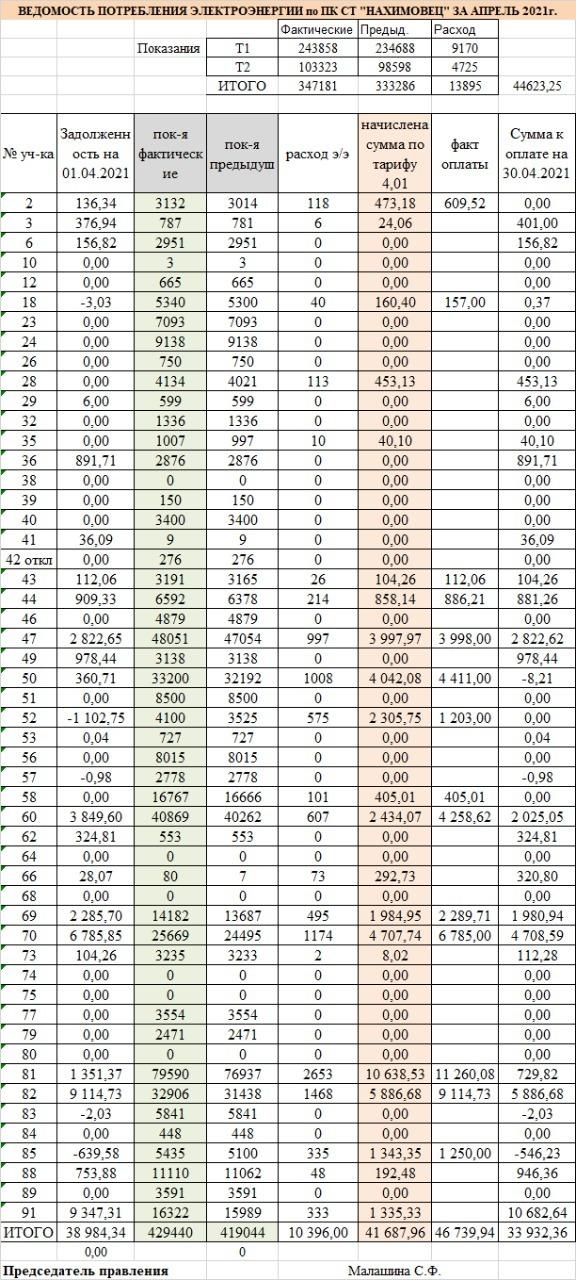 Ведомость потребления электроэнергии в ПК СТ "Нахимовец" за апрель 2021. Размер изображения увеличивается при нажатии на изображение.