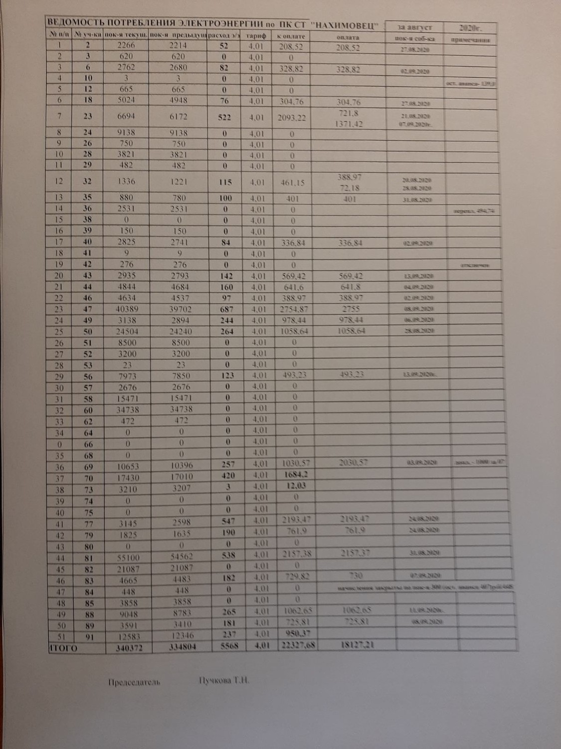 Ведомость потребления электроэнергии в ПК СТ "Нахимовец" за август 2020. Размер изображения увеличивается при нажатии на изображение.