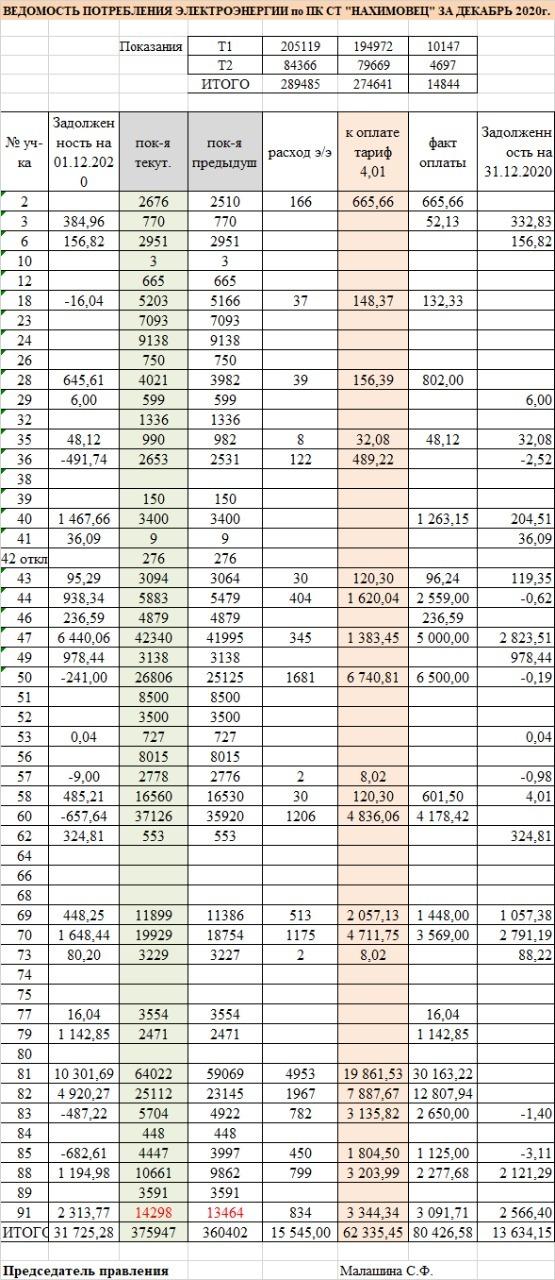 Ведомость потребления электроэнергии в ПК СТ "Нахимовец" за декабрь 2020. Размер изображения увеличивается при нажатии на изображение.