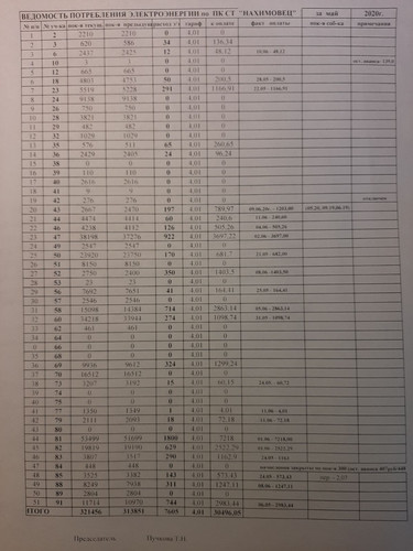 Ведомость потребления электроэнергии в ПК СТ "Нахимовец" за май 2020. Размер изображения увеличивается при нажатии на изображение.