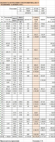 Ведомость потребления электроэнергии в ПК СТ "Нахимовец" за ноябрь 2020. Размер изображения увеличивается при нажатии на изображение.