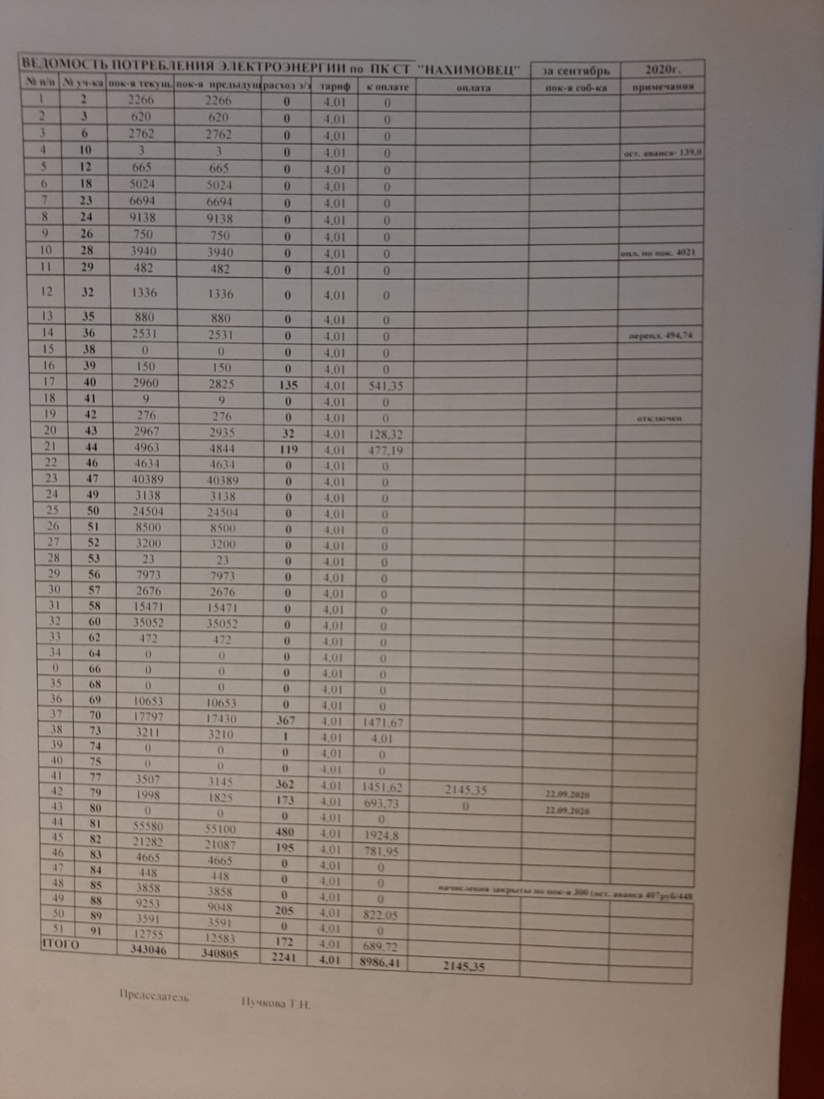 Ведомость потребления электроэнергии в ПК СТ "Нахимовец" за сентябрь 2020. Размер изображения увеличивается при нажатии на изображение.