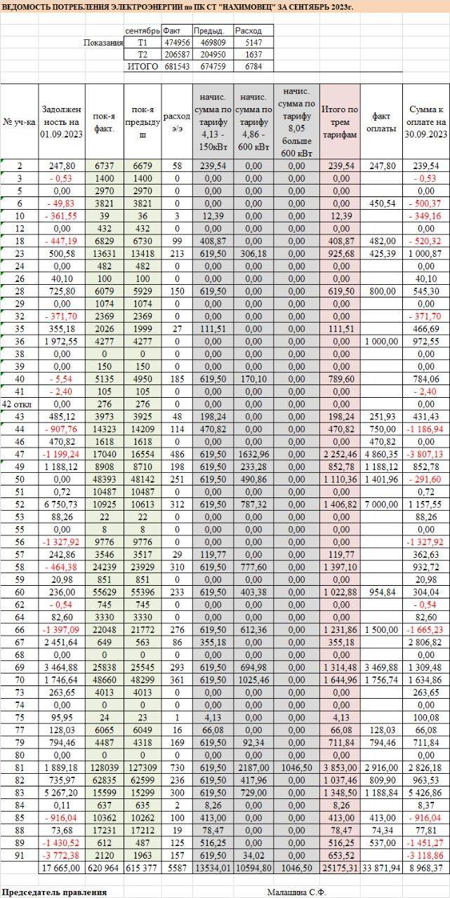 Ведомость потребления электроэнергии в ПК СТ "Нахимовец" за сентябрь 2023. Размер изображения увеличивается при нажатии на изображение.