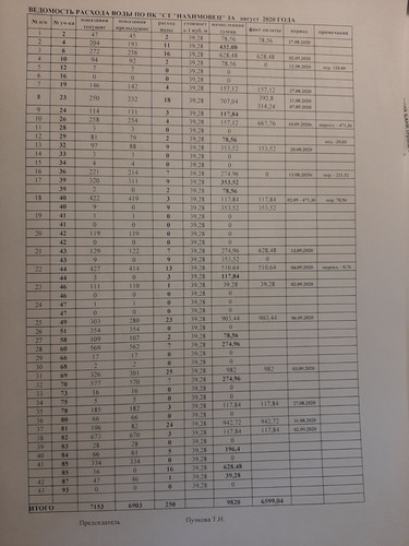 Ведомость расхода воды по ПК СТ "Нахимовец" за август 2020. Размер изображения увеличивается при нажатии на изображение.