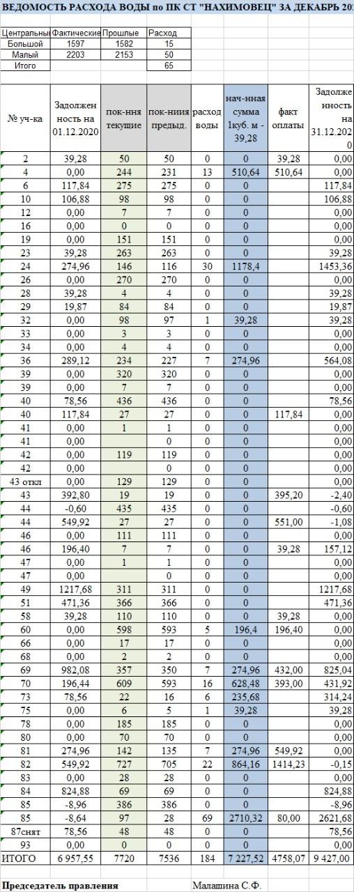 Ведомость расхода воды по ПК СТ "Нахимовец" за декабрь 2020. Размер изображения увеличивается при нажатии на изображение.
