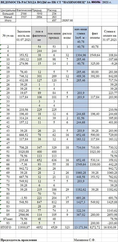 Ведомость расхода воды по ПК СТ "Нахимовец" за июль 2021. Размер изображения увеличивается при нажатии на изображение.