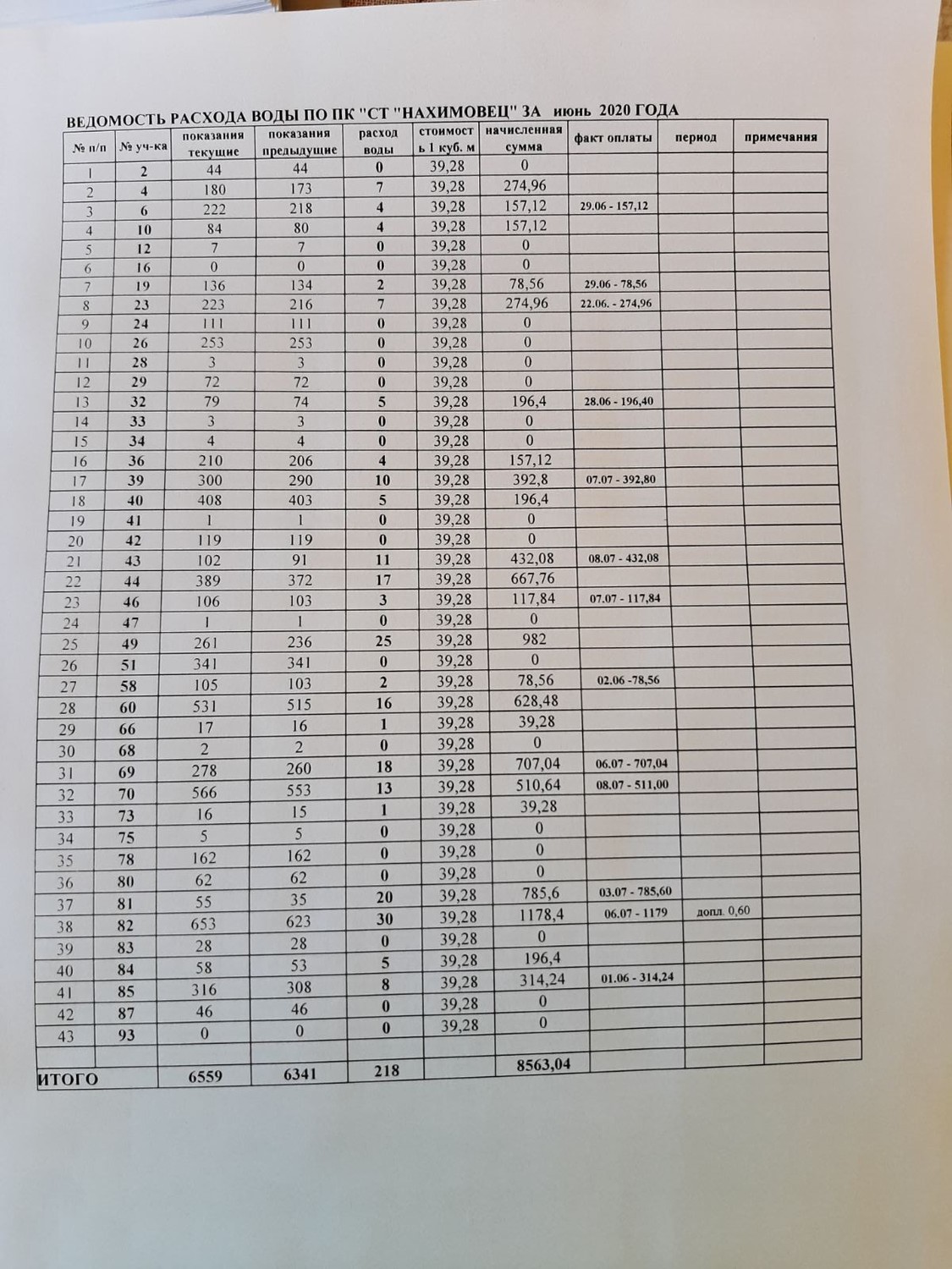 Ведомость расхода воды по ПК СТ "Нахимовец" за июнь 2020. Размер изображения увеличивается при нажатии на изображение.