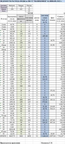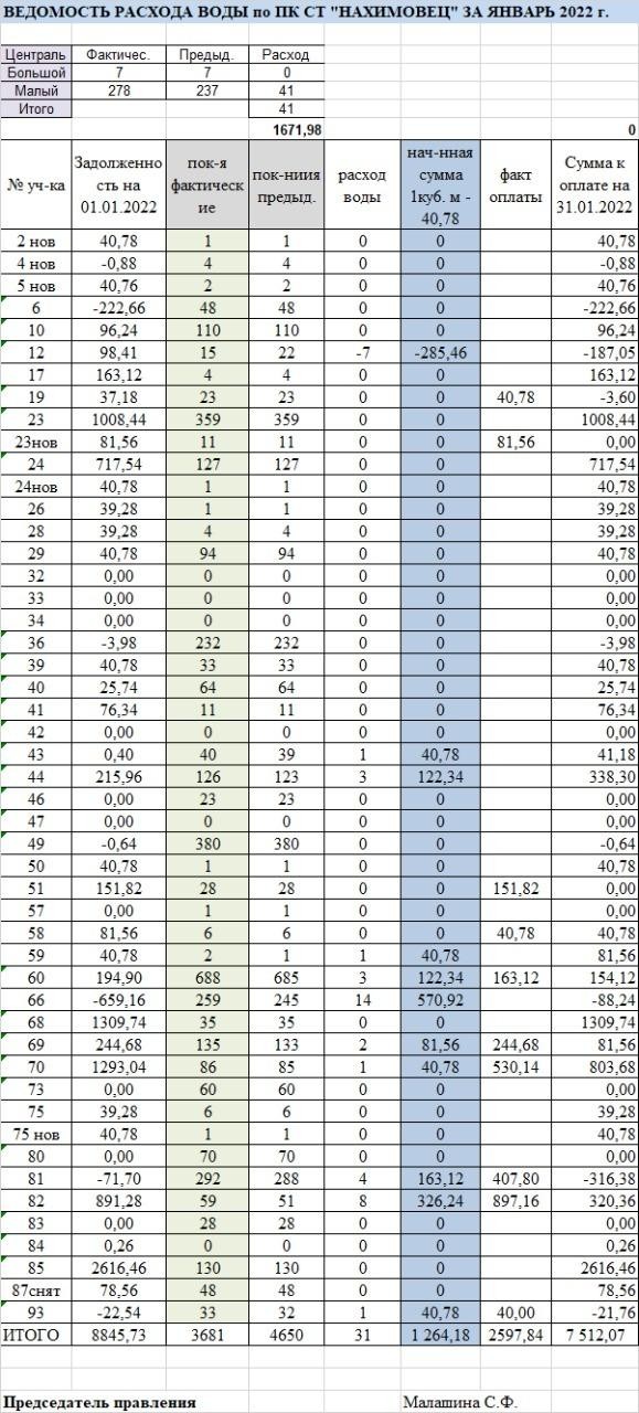 Ведомость расхода воды по ПК СТ "Нахимовец" за январь 2022. Размер изображения увеличивается при нажатии на изображение.