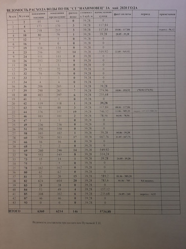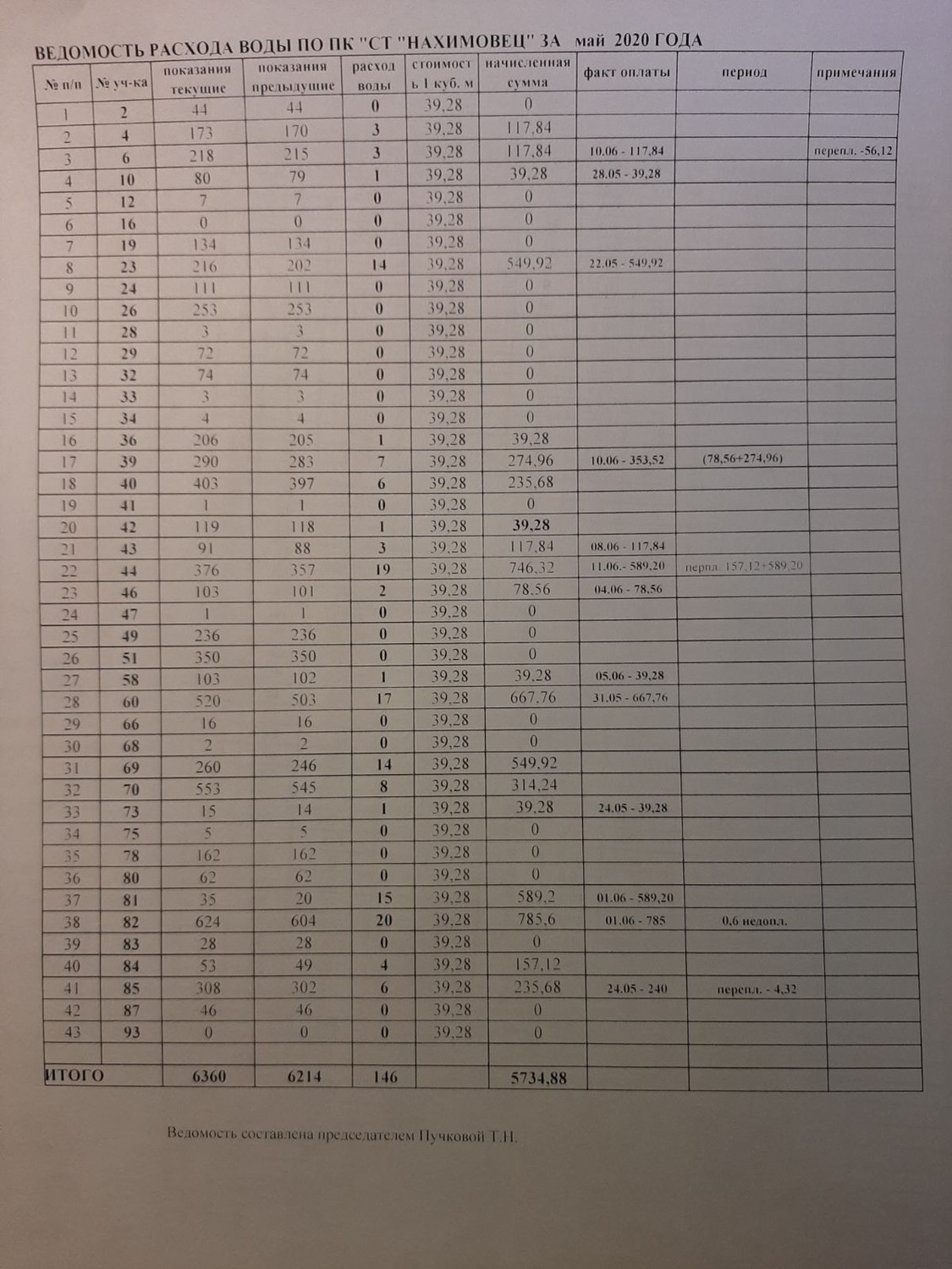 Ведомость расхода воды по ПК СТ "Нахимовец" за май 2020. Размер изображения увеличивается при нажатии на изображение.